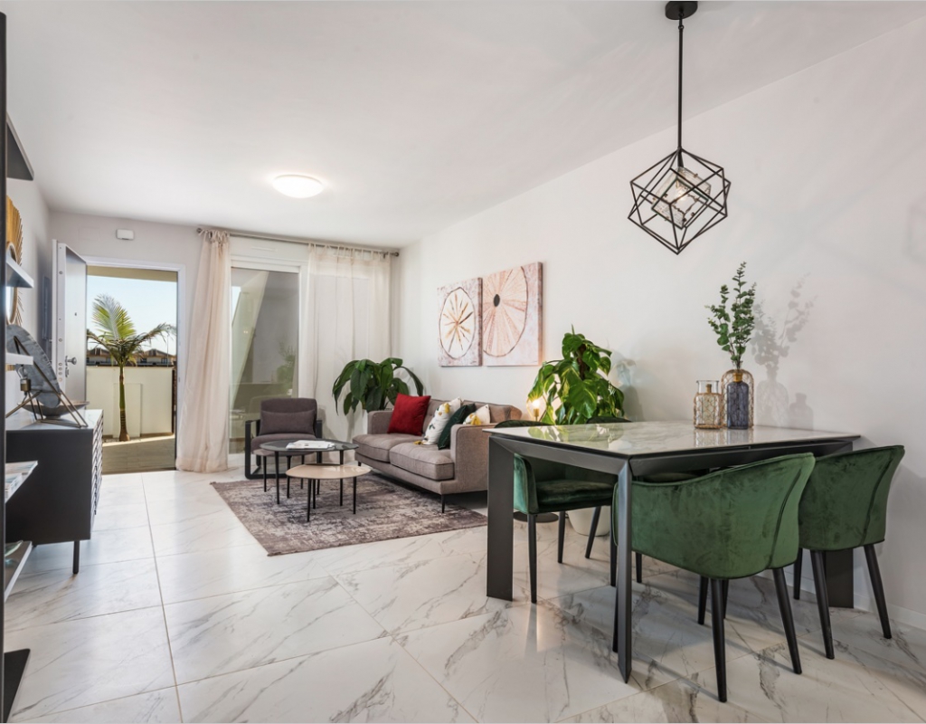 New build townhouse in Torre de la Horadada, Pilar de la Horadada. The house is composed of 3 bedrooms, 2 bathrooms, kitchen, living room. It has a constructed area of 204m2, a terrace of 21m2 and solarium of 32 m2. The residencial has wonderful communal areas, landscaped gardens and an attractive communal swimming pool. It is located a few meters from the sea. Torre de la Horadada is a prestigious area of the Costa Blanca, very close to Mil Palmeras, Campoamor, San Pedro del Pintar and Orihuela Costa. Only in 10 minutes you can reach the famous salt lagoons of San Pedro del Pinatar and Thalasia seaside resort. Pilar De La Horadada, enjoys more than 2500 hours of sun per year and average temperature of 18ºC, which makes it a privileged area. It has a wide area of services, green areas, promenades and marina. Only 5 minutes from the shopping centers La Zenia Boulevard and Dos Mares. These magnificent weather conditions are joined by sandy beaches such as Playa Jesuitas, Playa del Puerto and Playa de las Higuericas. Well connected with the national road N-332 and the motorway of the Mediterranean AP-7. Close to major cities such as Murcia and Alicante.