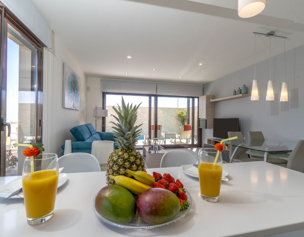 Villa adosada situada en una de las mejores zonas de San Pedro del Pinatar. La villa se distribuye en planta baja, primera y solarium de 53m2 opcional. Consta de 3 amplios dormitorios, 2 baños completos y cocina americana totalmente equipada. El salón dispone de un gran ventanal que aporta luminosidad, con salida a la terraza. El jardín de 81m2 con piscina privada de 6 x 2.50 aprox. El Residencial está compuesto de 6 villas. Espacio para el coche en la parcela.rnrnLa villa se encuentra en una zona privilegiada de San Pedro del Pinatar que está situado entre dos mares, el mar mediterráneo y el mar menor. Los residentes de esta zona tienen una oportunidad única de elegir entre disfrutar de las cálidas aguas del Mar Mediterráneo con bonitas playas de bandera azul o la laguna salada del Mar Menor, el mayor lago salado de Europa. El Mar Menor es ideal para la práctica de una gran cantidad de deportes náuticos, con sus aguas poco profundas y tranquilas, es ideal para la natación de niños pequeños y otras actividades acuáticas como la natación, padelsuft, kayak, windsurf y buceo. rnSan Pedro del Pinatar posee gran atractivo turístico y ecológico por su parque natural de las Salinas y Arenales de San Pedro del Pinatar, para los enamorados del golf pueden elegir entre 5 de los campos de la zona como Lo Romero Golf, Las Colinas Golf, Serena Golf, Villamartin Golf, Las Ramblas Golf, a escasos 5 minutos del campo de fútbol, gimnasio, pistas de tenis y cricket. Está a 700 metros del centro de San Pedro del Pinatar donde se pueden encontrar todo tipo de servicios. En sus cercanías tiene los importantes núcleos urbanos como Torrevieja, Murcia, Alicante y Cartagena. Conecta fácilmente con la carretera nacional N-332 y la autovía del mediterráneo AP-7.